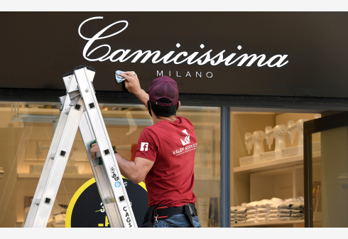 4月26日,在马耳他斯利马,工人清洁恢复营业商店的标志牌。 当日起,马耳他进一步放松疫情防控措施,非...