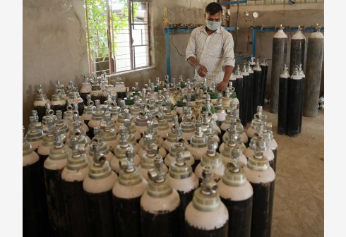 4月26日,工人在印度阿加尔塔拉填充氧气罐。 印度卫生部26日公布的数据显示,该国较前一日新增新冠确...