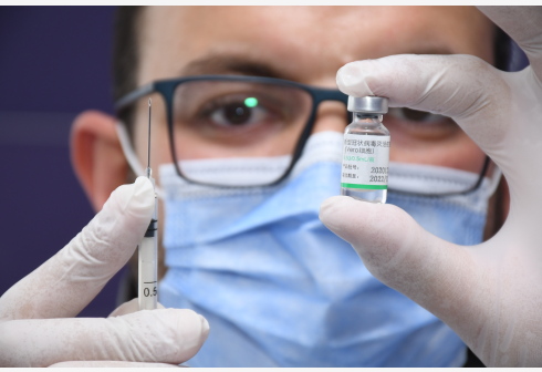 这是2021年1月30日,一名医务人员在摩洛哥西迪卡塞姆一处疫苗接种站展示中国国药的新冠灭活疫苗。 ...