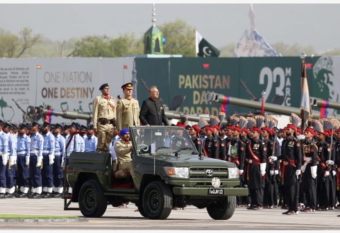 3月25日,巴基斯坦总统阿尔维(车中站立者右)在伊斯兰堡举行的“巴基斯坦日”阅兵式上检阅部队。 巴基...