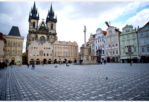 这是3月22日在捷克首都布拉格市中心老城广场拍摄的为悼念新冠逝者而画在地面上的白色十字架。 未经允许...