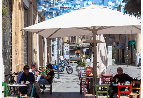 3月16日,人们坐在塞浦路斯首都尼科西亚一家咖啡馆的室外区域。 塞浦路斯16日重新开放餐厅和咖啡厅,...