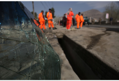 这是3月18日在阿富汗首都喀布尔的袭击现场拍摄的破碎的汽车玻璃。 阿富汗警方说,首都喀布尔一辆政府部...