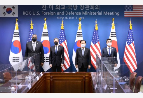 3月18日,美国国防部长奥斯汀、美国国务卿布林肯、韩国外交部长官郑义溶、韩国国防部长官徐旭(从左至右...