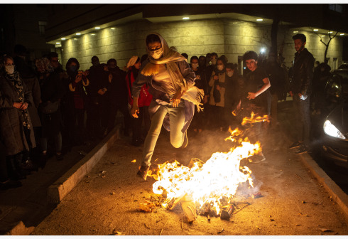 3月16日深夜,伊朗民众在首都德黑兰街头庆祝“跳火节”时跳过火堆。 跳火节是伊朗新年诺鲁孜节前的传统...