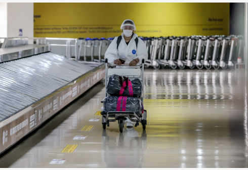 3月17日,戴口罩的乘客带着行李走在菲律宾马尼拉国际机场。 菲律宾政府16日晚宣布,为遏制疫情反弹,...