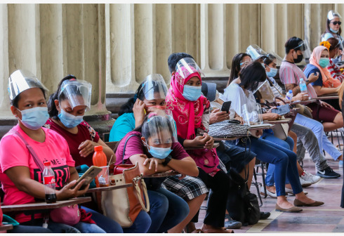 3月16日,人们头戴防护面罩在菲律宾首都马尼拉排队等候办理身份证明文件。 近期菲律宾国内新冠疫情呈快...