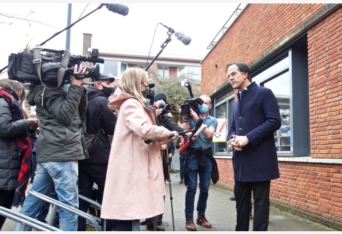 3月17日,荷兰看守内阁首相吕特在荷兰海牙一处投票站对媒体讲话。 2021年荷兰议会选举投票活动15...