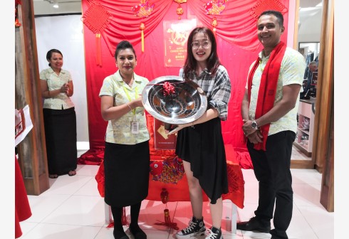 2月25日,在斐济苏瓦,一名女子在杰克之家的元宵节庆祝活动上展示自己获得的当地特色奖品。 杰克之家是...