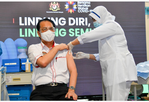 2月24日,马来西亚卫生部总监努尔·希沙姆在普特拉贾亚接种新冠疫苗。 马来西亚24日正式启动新冠疫苗...