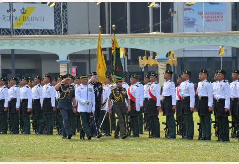 2月23日,在文莱首都斯里巴加湾市中心赛福鼎广场,文莱国家元首、苏丹哈桑纳尔·博尔基亚(前右一)检阅...