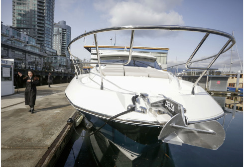 2月24日,在加拿大温哥华,组织者从一款2021温哥华国际船展的参展游艇旁走过。 当日,2021温哥...