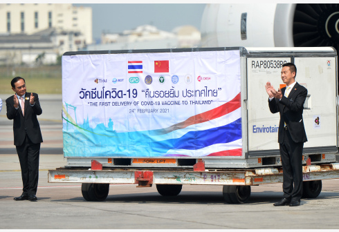 2月24日,泰国总理巴育(左)、中国驻泰国大使馆临时代办杨欣在曼谷素万那普机场迎接中国科兴新冠疫苗。...