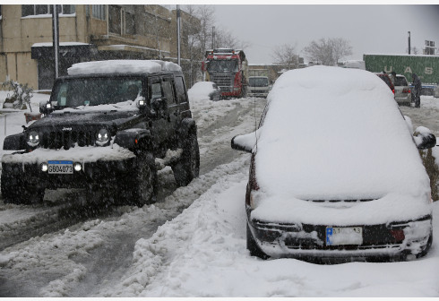 2月17日,在黎巴嫩黎巴嫩山省,车辆在积雪的道路上行驶。 当天,暴风雪袭击黎巴嫩部分地区,对当地交通...