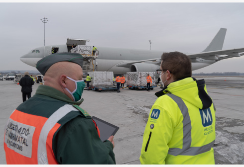 2月16日,在匈牙利首都布达佩斯,机场工作人员卸载中国出口匈牙利的首批新冠疫苗。 中国出口匈牙利的首...