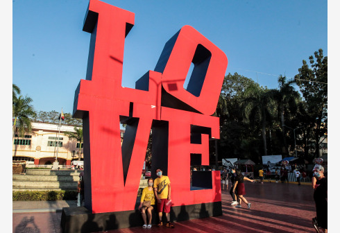 2月14日,菲律宾马尼拉的一对情侣在“爱”字雕塑下合影。 当天是西方情人节。 未经允许不得转载:城市...