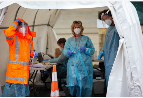 2月15日,医务人员在新西兰奥克兰一处临时检测点工作。 新西兰总理杰辛达·阿德恩14日宣布,新西兰最...
