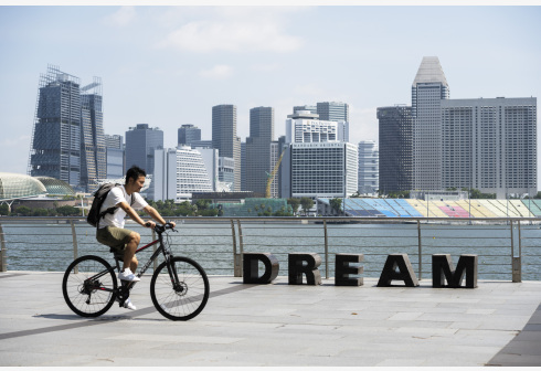 2月15日,一名男子在新加坡滨海湾骑自行车。 新加坡贸易和工业部15日发布经济调查报告说,新加坡经济...