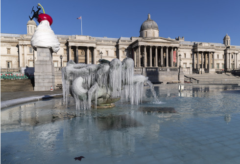 这是2月10日在英国伦敦特拉法加广场拍摄的被冰柱覆盖的雕塑。 持续多日的降雪天气将伦敦的一些雕塑装扮...