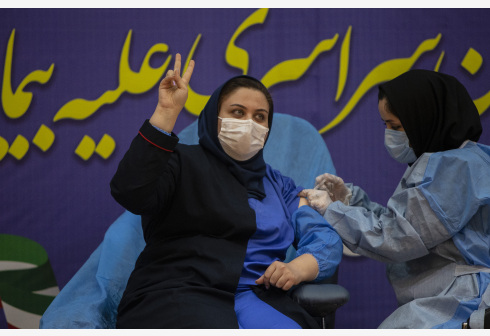 2月9日,在伊朗德黑兰,医务人员为接种者注射新冠疫苗。 伊朗9日启动新冠疫苗接种工作,首批接种人群为...