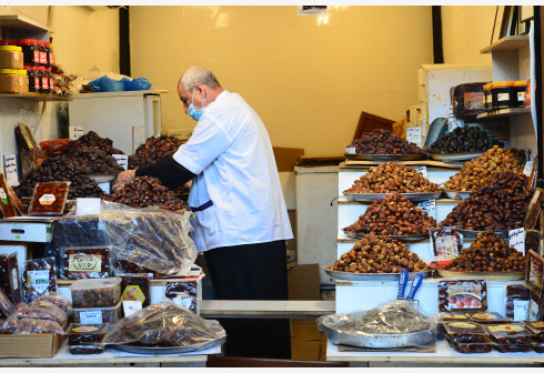 2月9日,在科威特首都科威特城,一名佩戴口罩的商贩在食品店铺中等待顾客。 科威特规定从2月7日开始的...