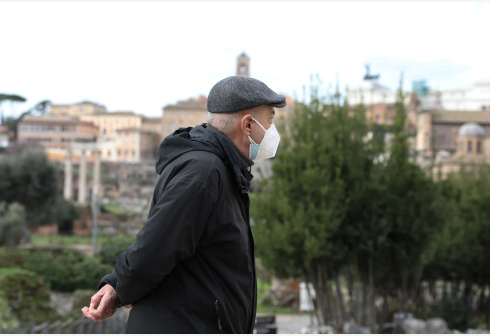 意大利多地开始放松疫情管控措施 2月1日,在意大利首都罗马,一名戴着口罩的男子在重新开放的古罗马广场...