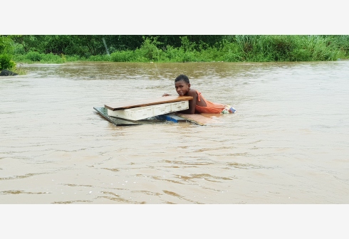 1月29日,斐济西部巴镇的一名女孩在洪水中抓住木板。 受热带低气压的影响,斐济全国部分地区29日遭受...