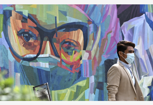 马来西亚单日新增新冠病例数超过5000例 1月29日,戴口罩的行人走过马来西亚吉隆坡街头的一处医护人...