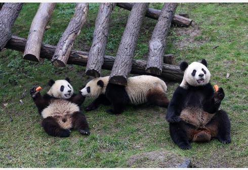 1月27日,大熊猫“好好”和它的双胞胎幼崽“宝弟”和“宝妹”在比利时布吕热莱特天堂动物园进食。 20...