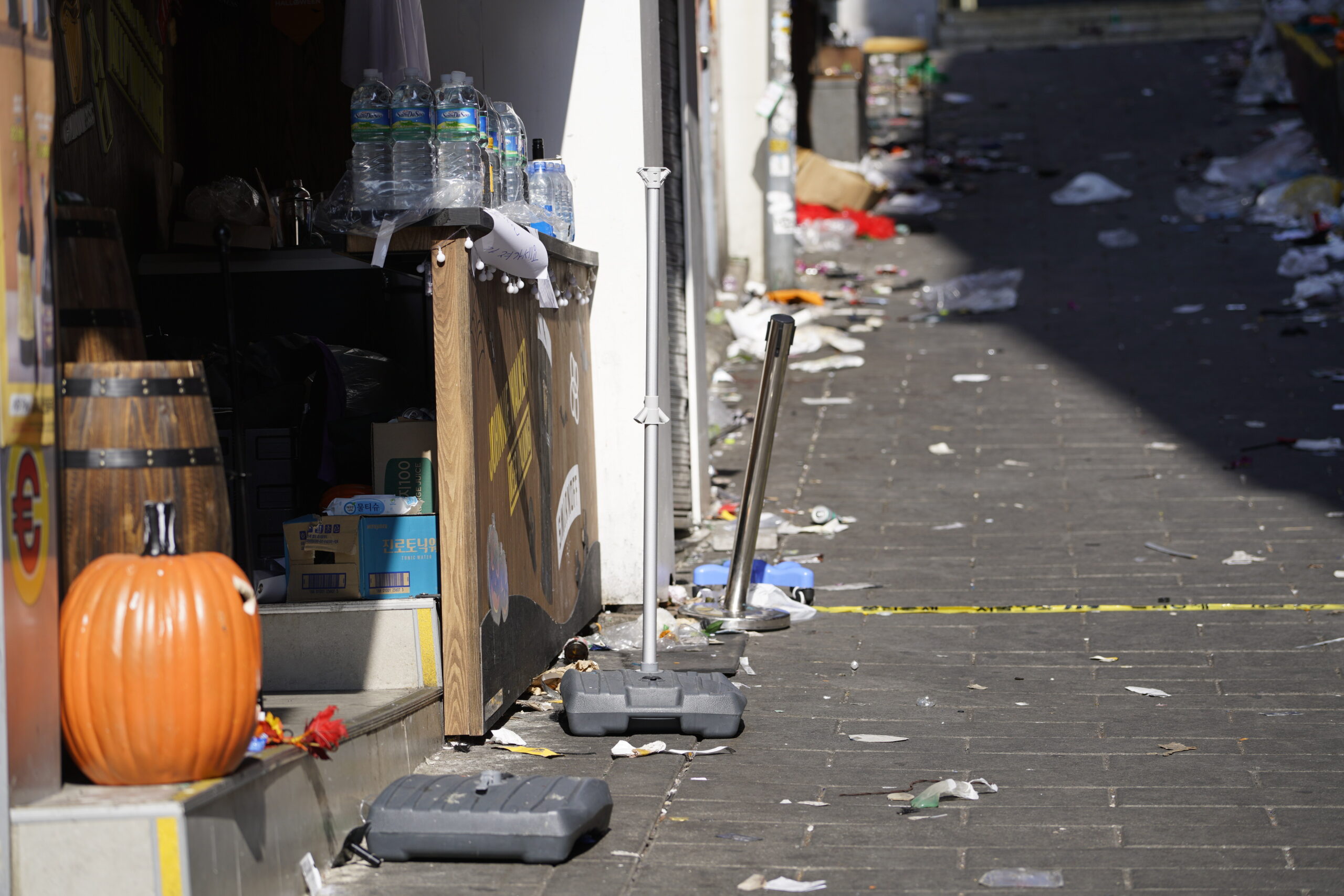 当地时间10月31日,首尔梨泰院踩踏事故现场依旧封锁。图为事故发生地附近巷子残留的万圣节装饰。 未经...