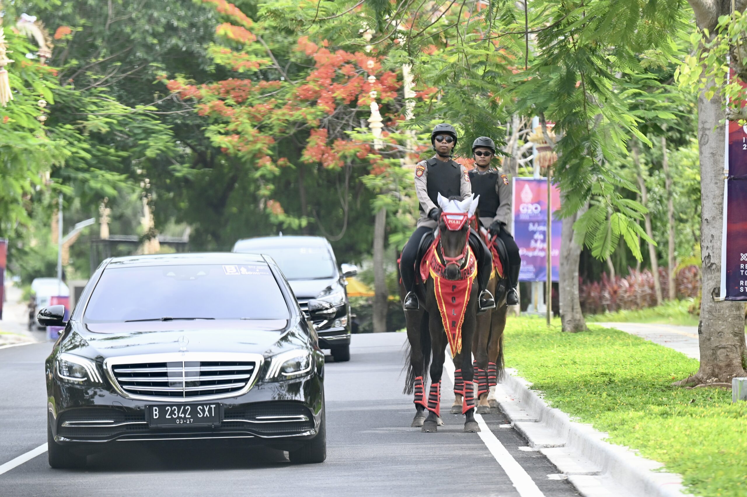 11月14日,G20峰会主会场附近警员骑马巡逻。二十国集团领导人第十七次峰会将于15日至16日在印尼...