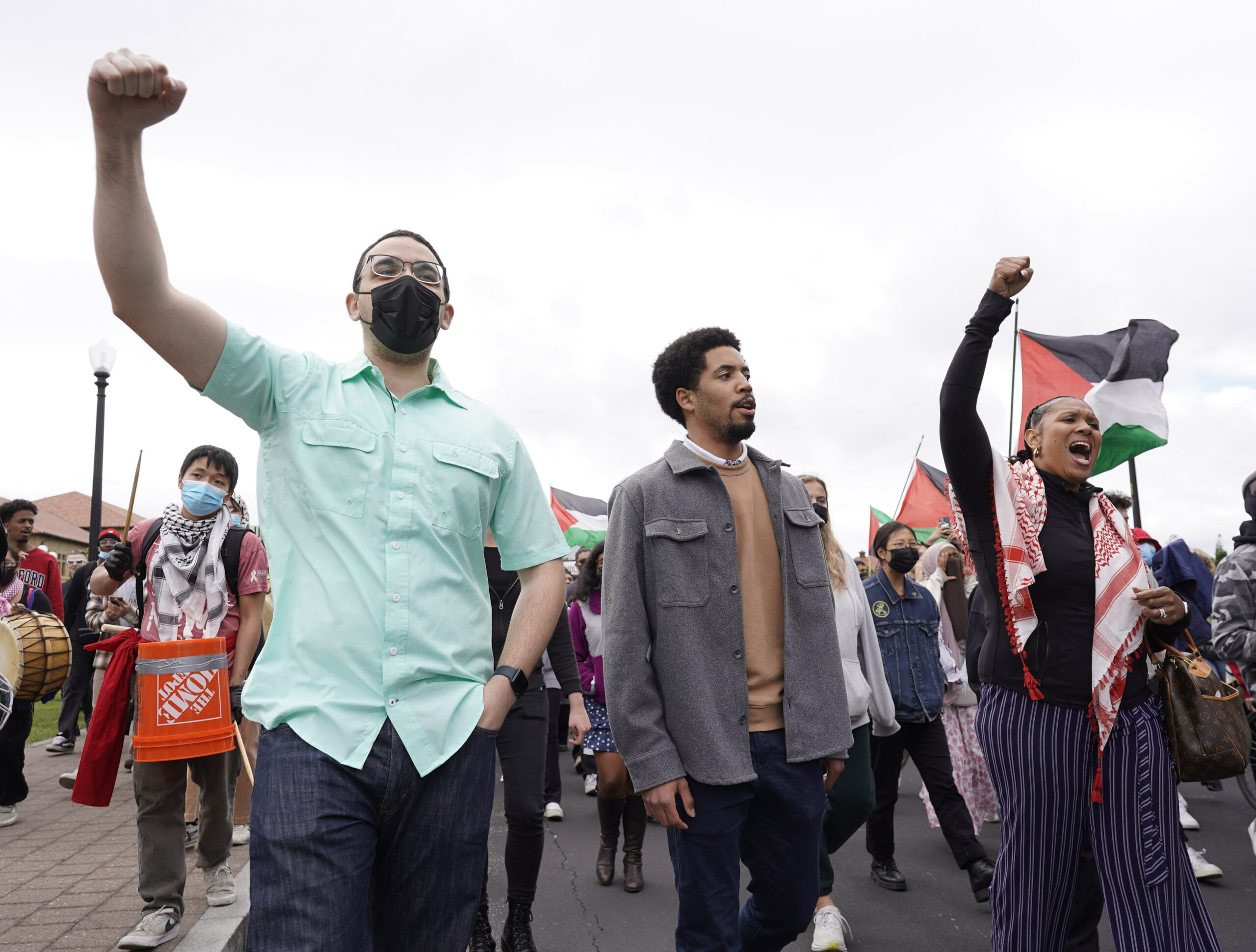 当地时间4月25日,抗议者在美国加州斯坦福大学参加示威活动。连日来,数所知名美国高等学府爆发示威,要...