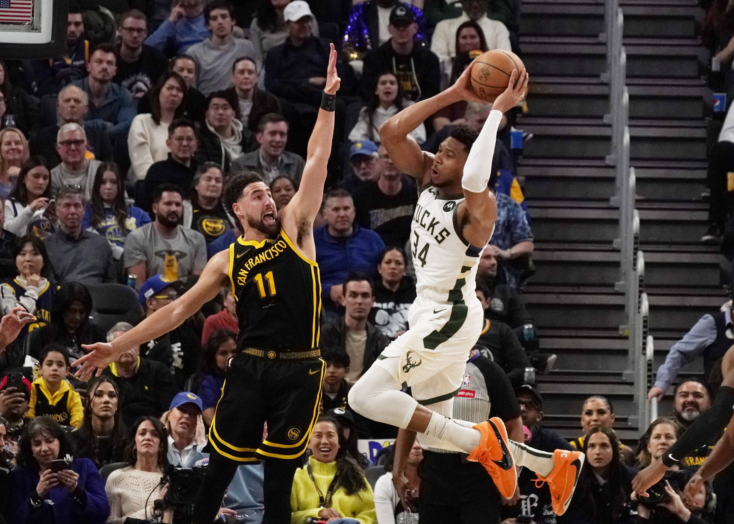 当地时间3月6日,勇士队球员汤普森(左)在比赛中防守雄鹿队球员安特托昆博。当日,在2023-2024...