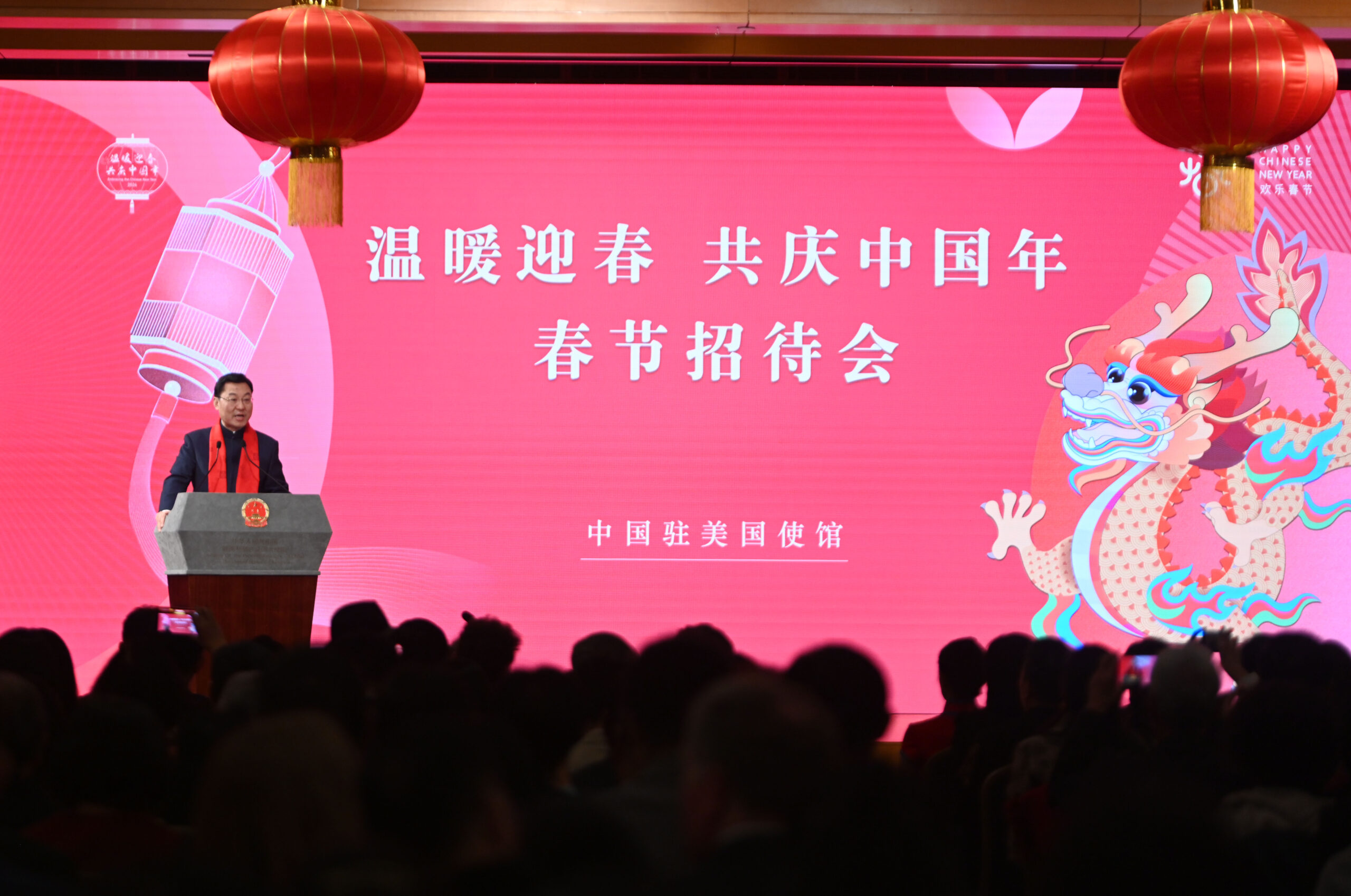 当地时间2月5日,中国驻美大使馆在华盛顿举办“温暖迎春·共庆中国年”侨学界专场春节招待会。图为驻美大...