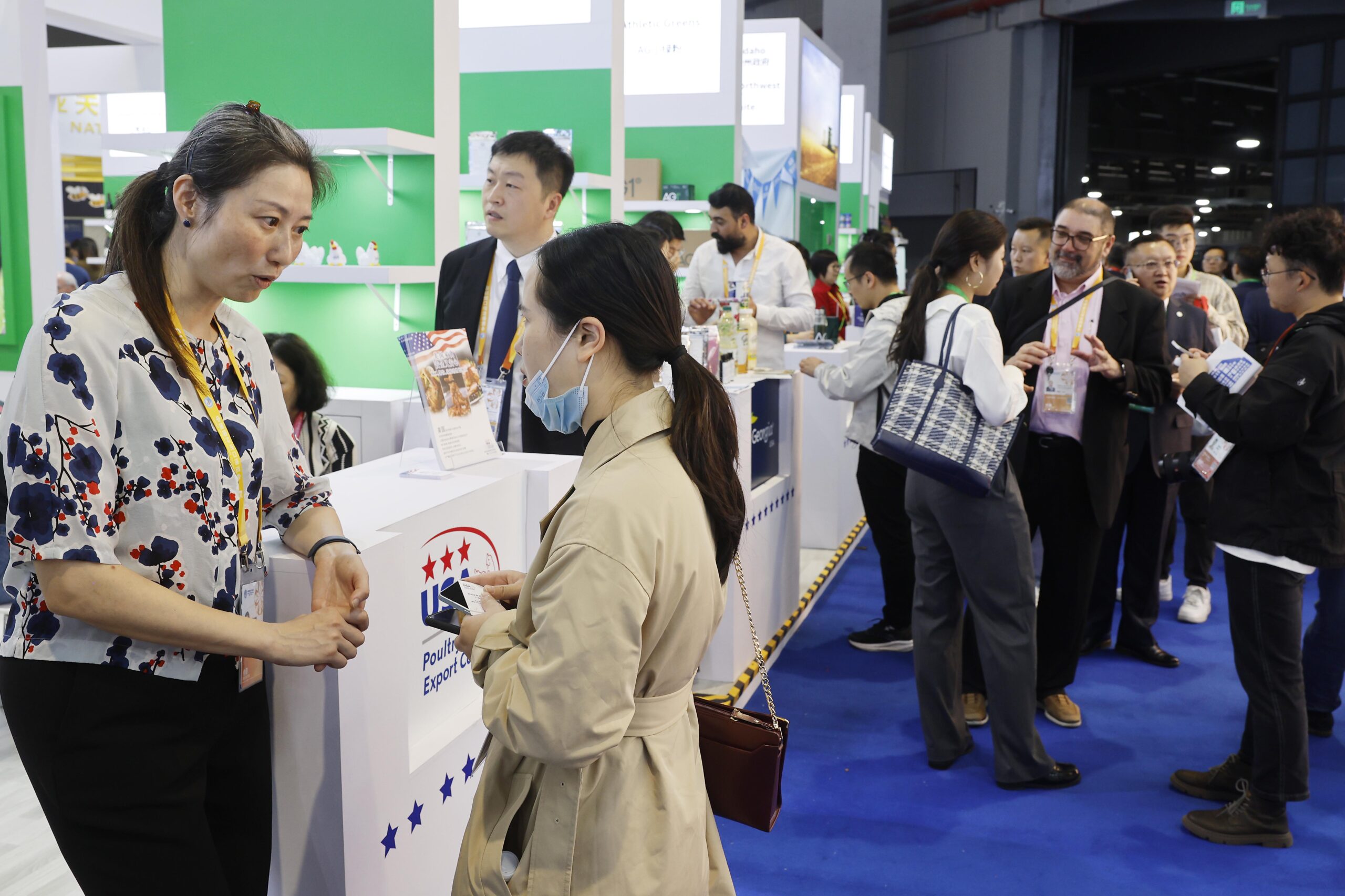 11月6日,参观者与展台工作人员交流。当日,第六届中国国际进口博览会在国家会展中心(上海)举行。据上...