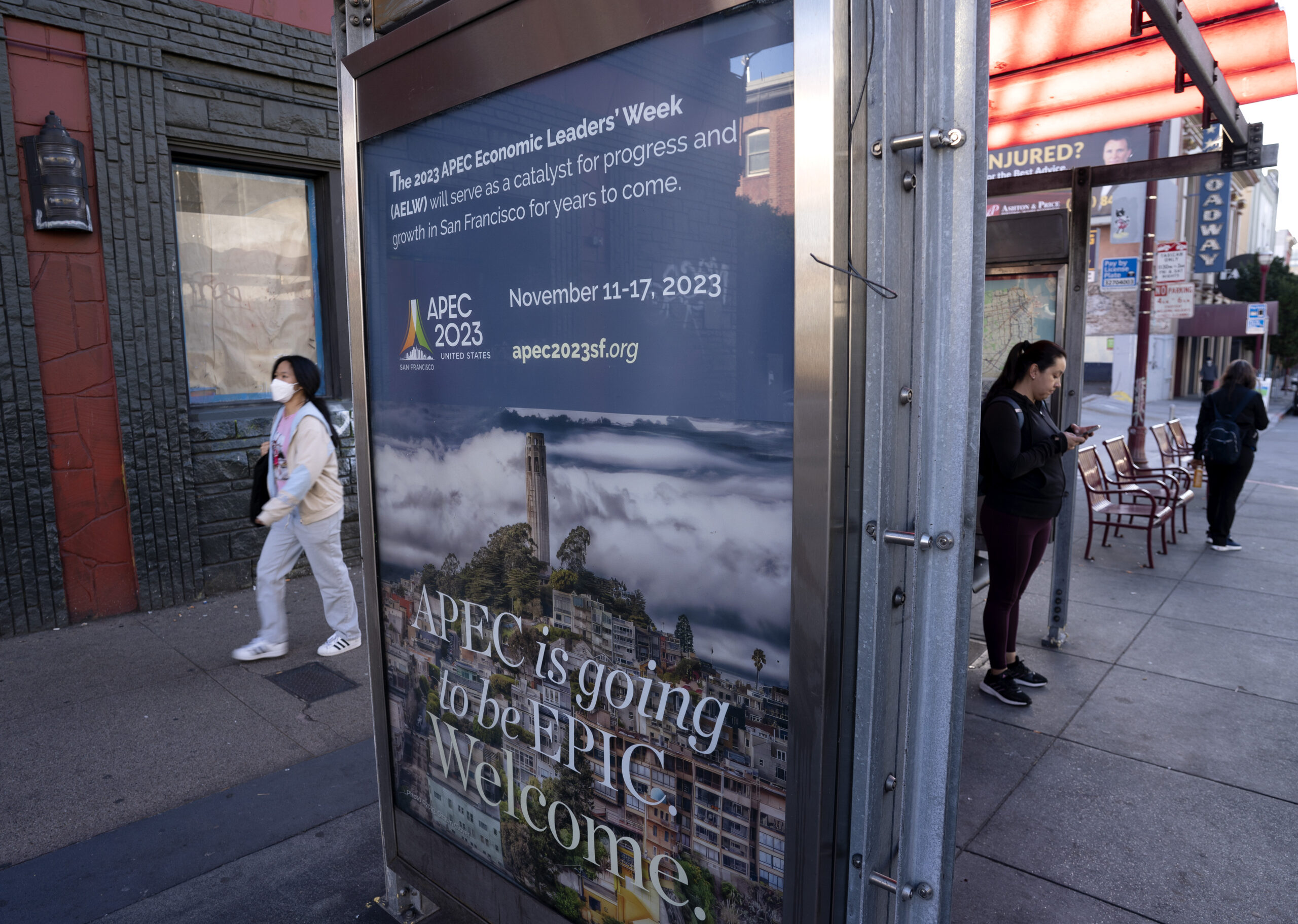 当地时间11月1日,关于APEC的标识出现在美国加州旧金山一处公交站。亚太经济合作组织(APEC)领...