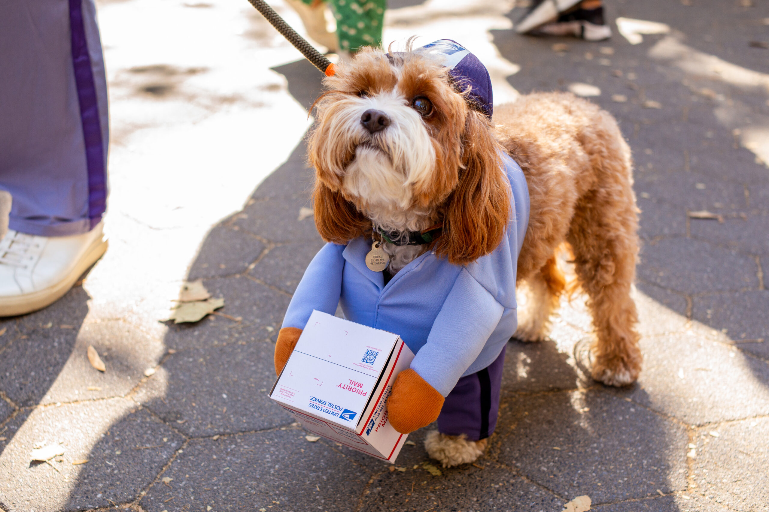 当地时间10月28日,美国纽约华盛顿广场公园举行万圣节狗狗游行,宠物狗及其主人穿上各种有趣的服装,与...