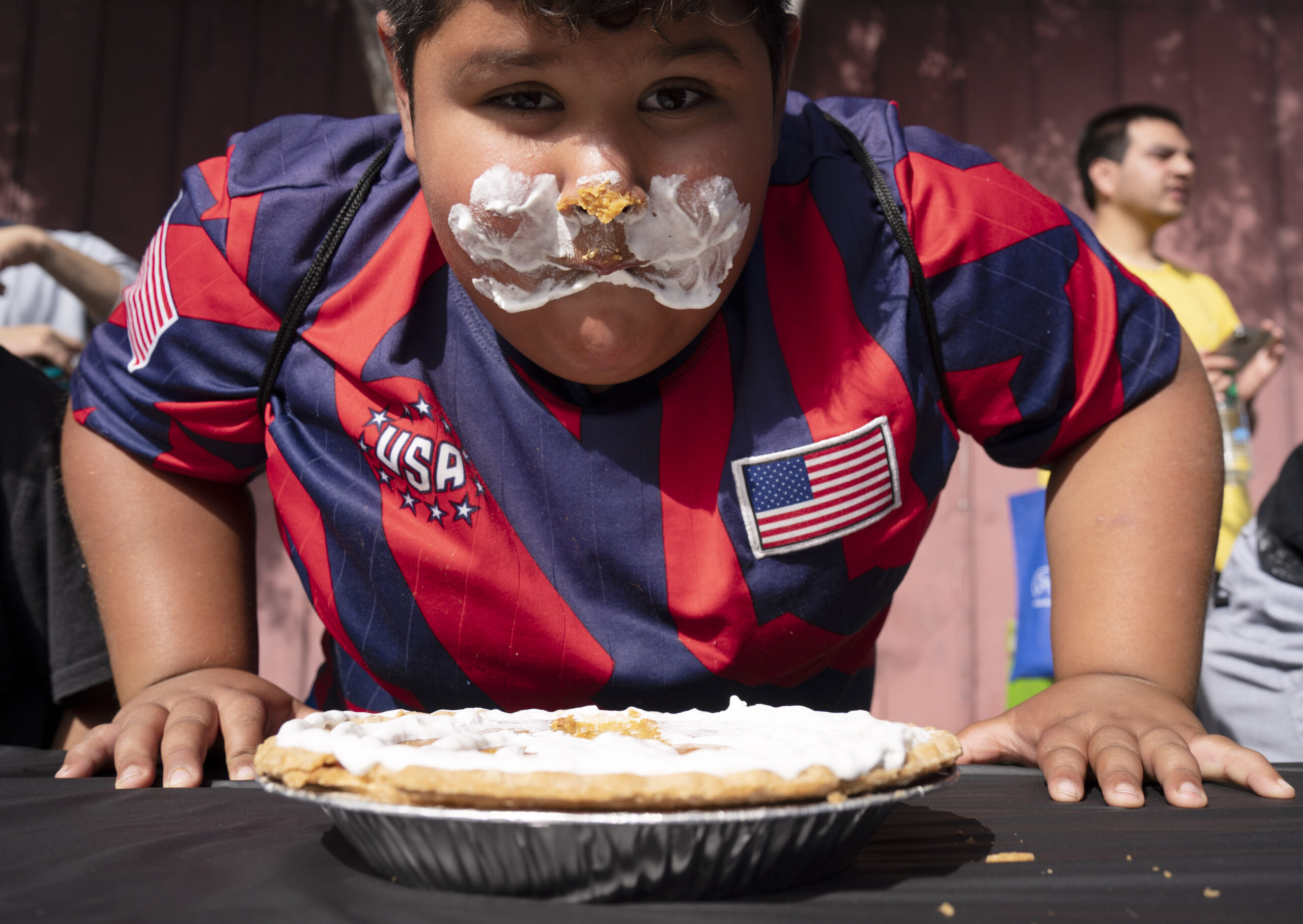 当地时间10月15日,参赛者在美国北加州半月湾市举办的吃南瓜派比赛上“大快朵颐”。当日,一年一度的吃...