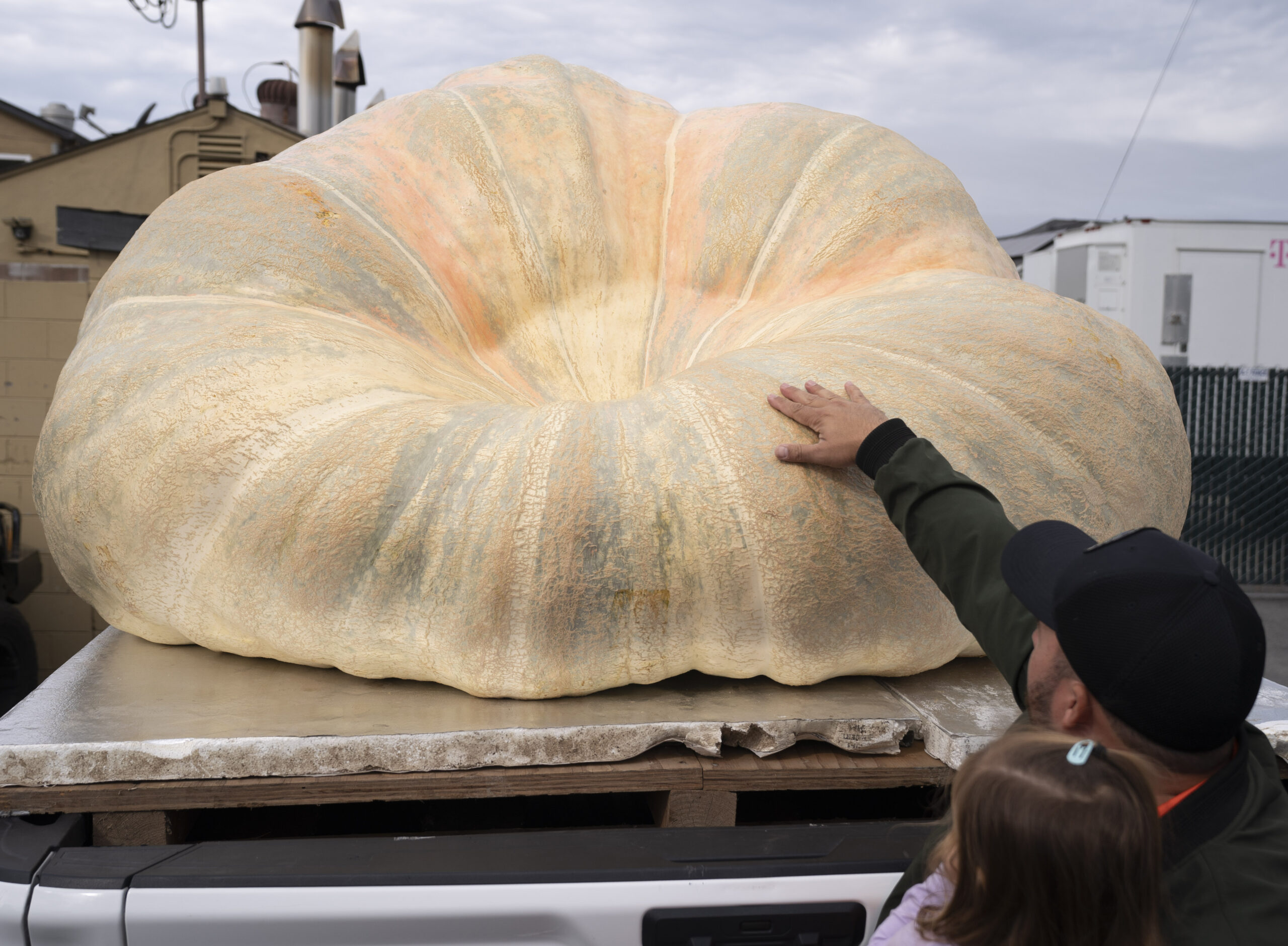 当地时间10月9日,一年一度的南瓜称重大赛在美国北加州圣马特奥县半月湾举行,准备亮相的一个巨型南瓜吸...