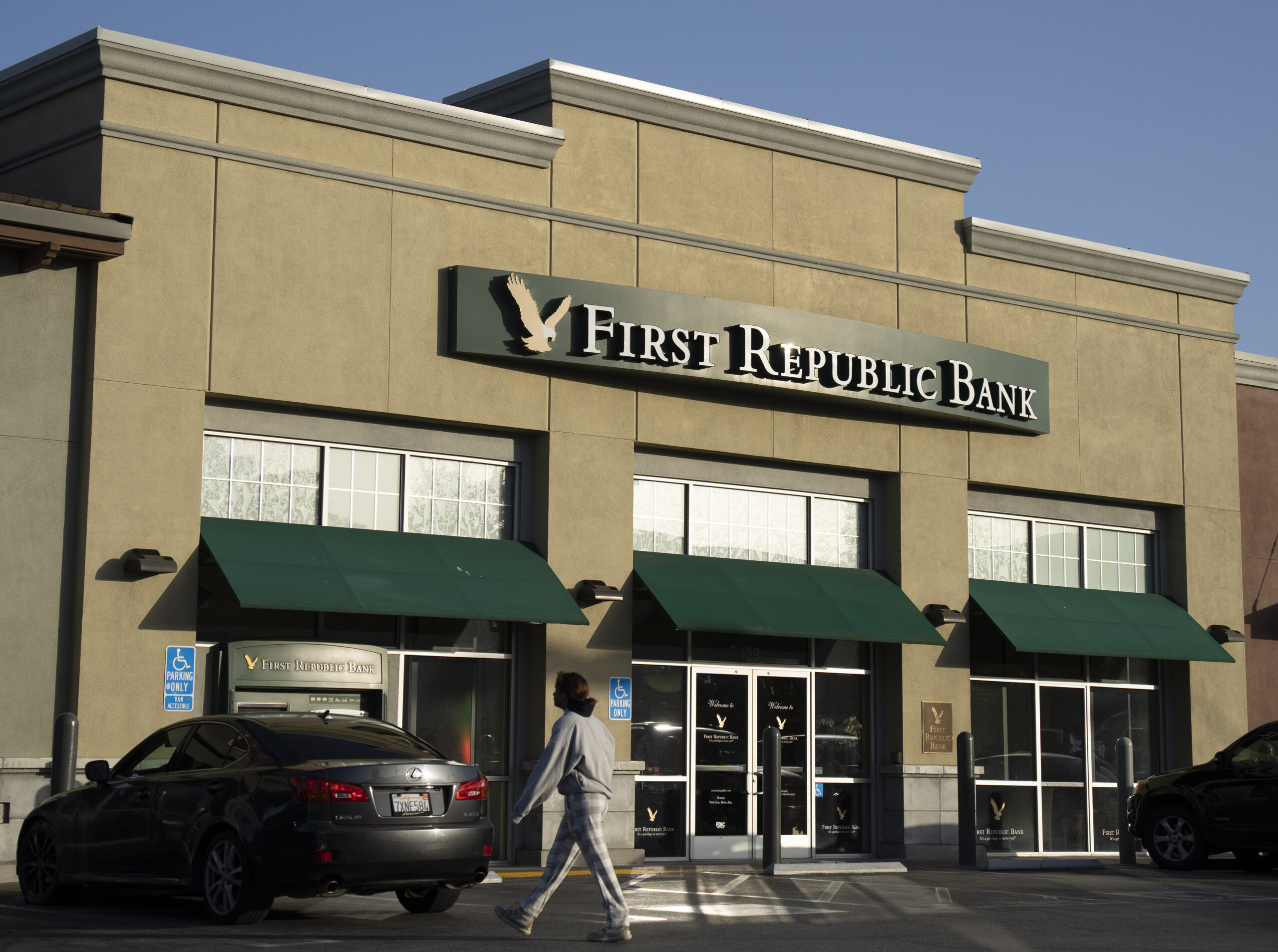 当地时间4月24日,行人从美国加州米尔布雷市一家第一共和银行(First Republic Bank...