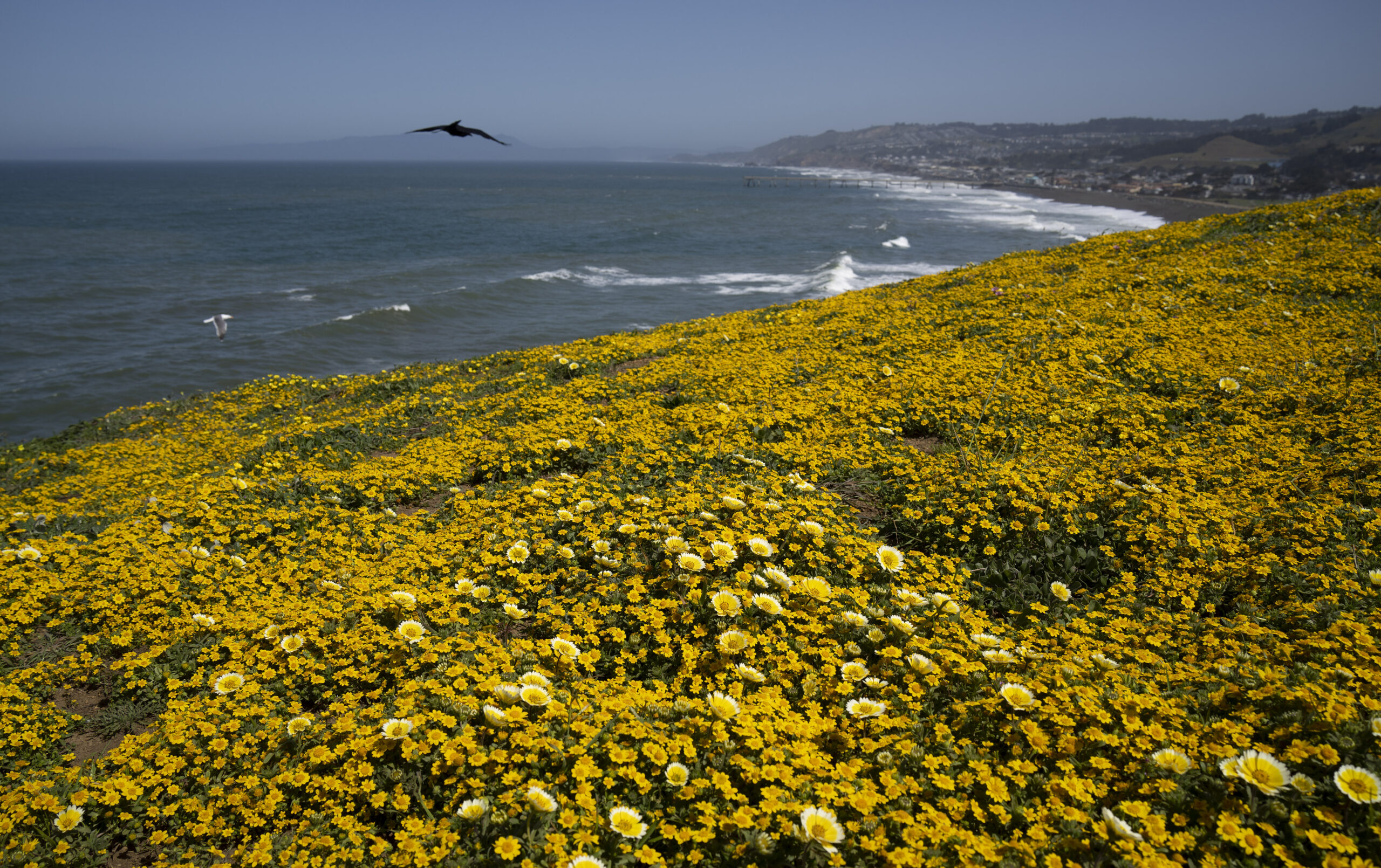 当地时间4月24日,美国加州帕西菲卡一处海边野花绽放。数月以来,接二连三的冬季风暴为加州带来充沛降水...
