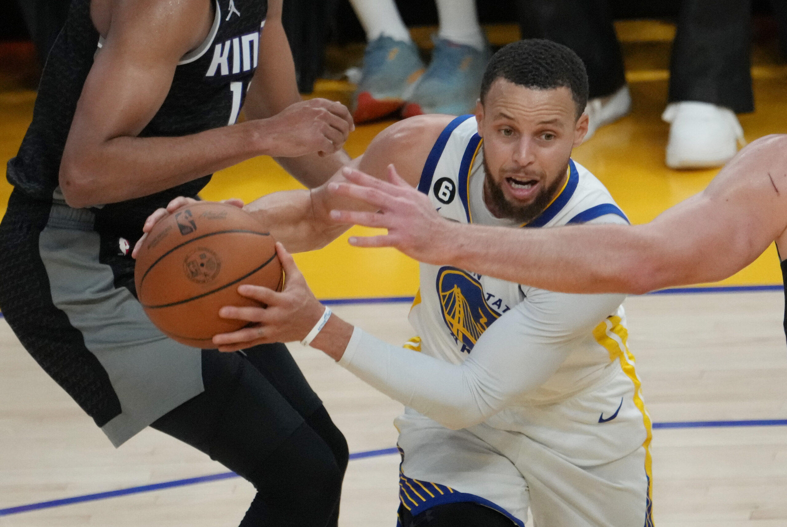 当地时间4月23日,勇士队球员库里在比赛中拼抢。当日,在2022-2023赛季NBA季后赛首轮比赛中...