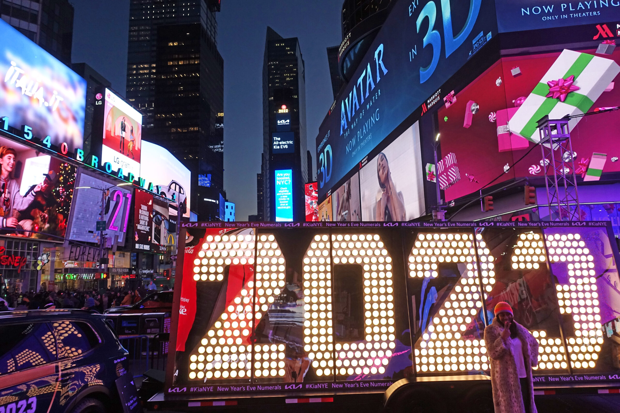 当地时间12月21日,一名女子在纽约时报广场与巨型数字灯“2023”合影。随着跨年夜临近,代表新年的...
