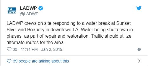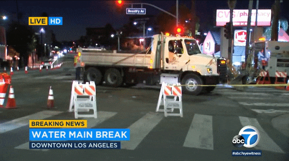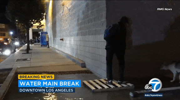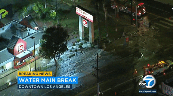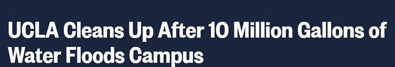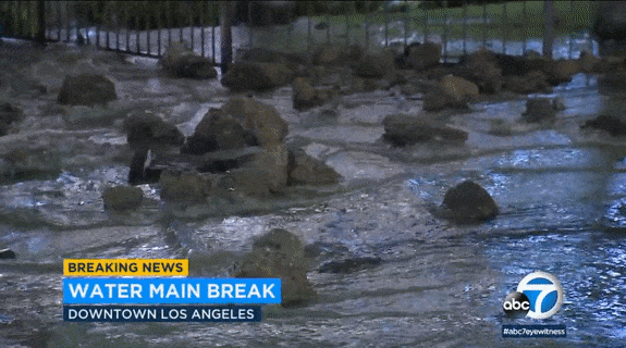 2014年洛杉矶一处有90年历史的主水管道破裂,目击者称当时大约有30英尺高的泉水喷涌而出,淹没了日落大道(Sunset Boulevard)和加州大学洛杉矶分校(UCLA)的部分地区,在极度缺水的洛杉矶级地区,在连洗澡时间都要受限制的南加州,这次事件白白流失了多达1000万加仑的水。