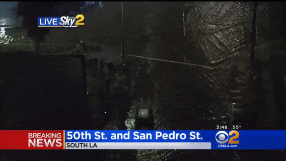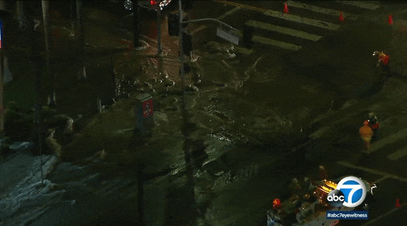 这次洪水发生在晚上10点40,洛杉矶水电部门维修人员在周三晚上11点左右就开始对爆裂的水管进行抢修。