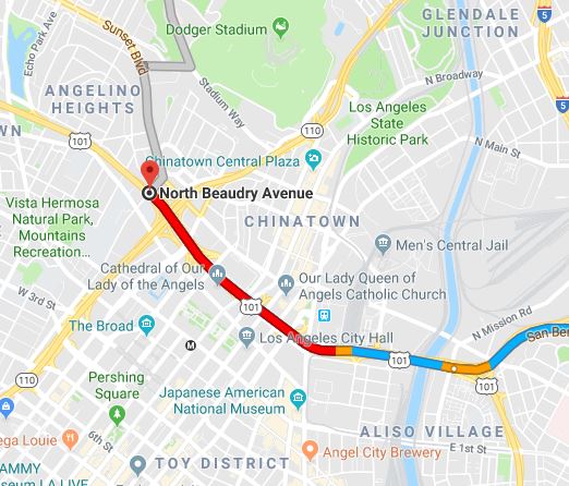 现场修复人员仍在奋力抢修被水淹没的路面,但部分地区的路面似乎已经开始变形,博德利大道(Beaudry Avenue)南行的车道依旧关闭。