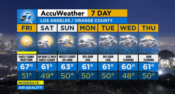 据《洛杉矶时报》根据位于奥克斯纳德(Oxnard)的美国国家气象局(National Weather Service)称,预计从周五晚间开始,洛杉矶县将迎来小雨,并持续到周六上午,周六全天可能会有零星阵雨。预计白天温度将为60度左右,晚间将降至40度。
