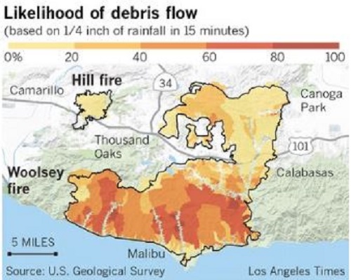 据悉,这场最强降雨将在傍晚通勤时间侵袭洛杉矶,并将持续整个通宵。由于泥石流和山洪将威胁整个洛杉矶地区,马里布山火地区的300户居民和伯班克(Burbank)地区的居民已经被要求强制撤离,因为这些地区的山上已经无植被可以吸收此次暴雨带来的降水。