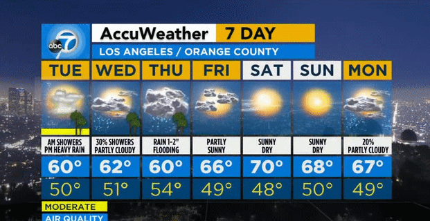 下面附上洛杉矶和橙县地区接下来几日的天气预报: