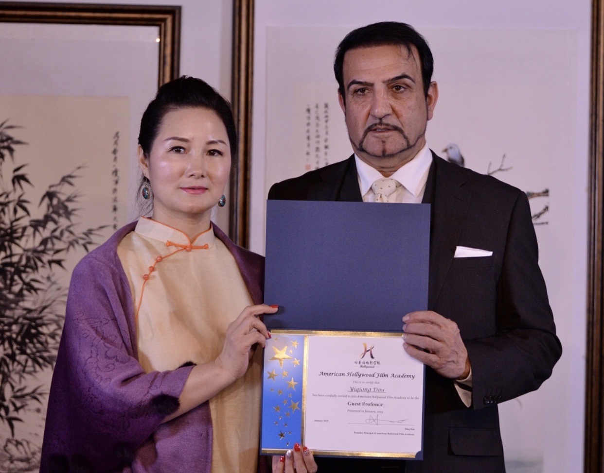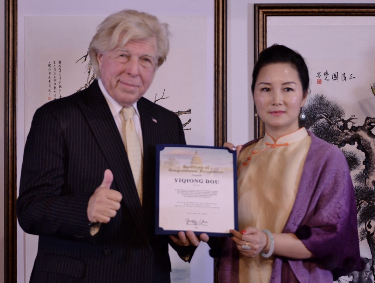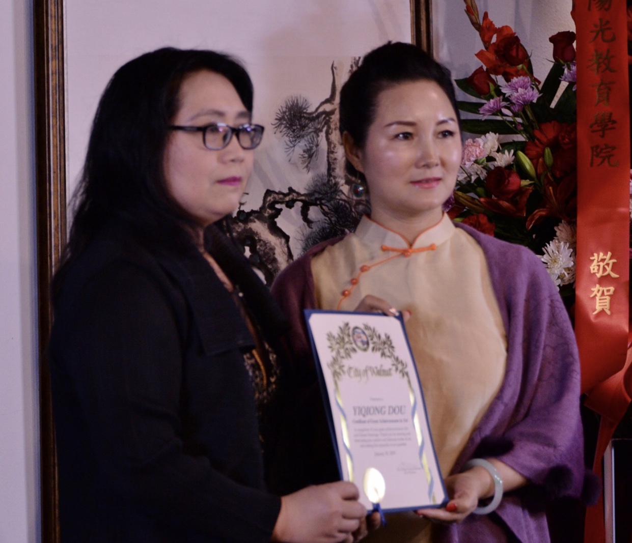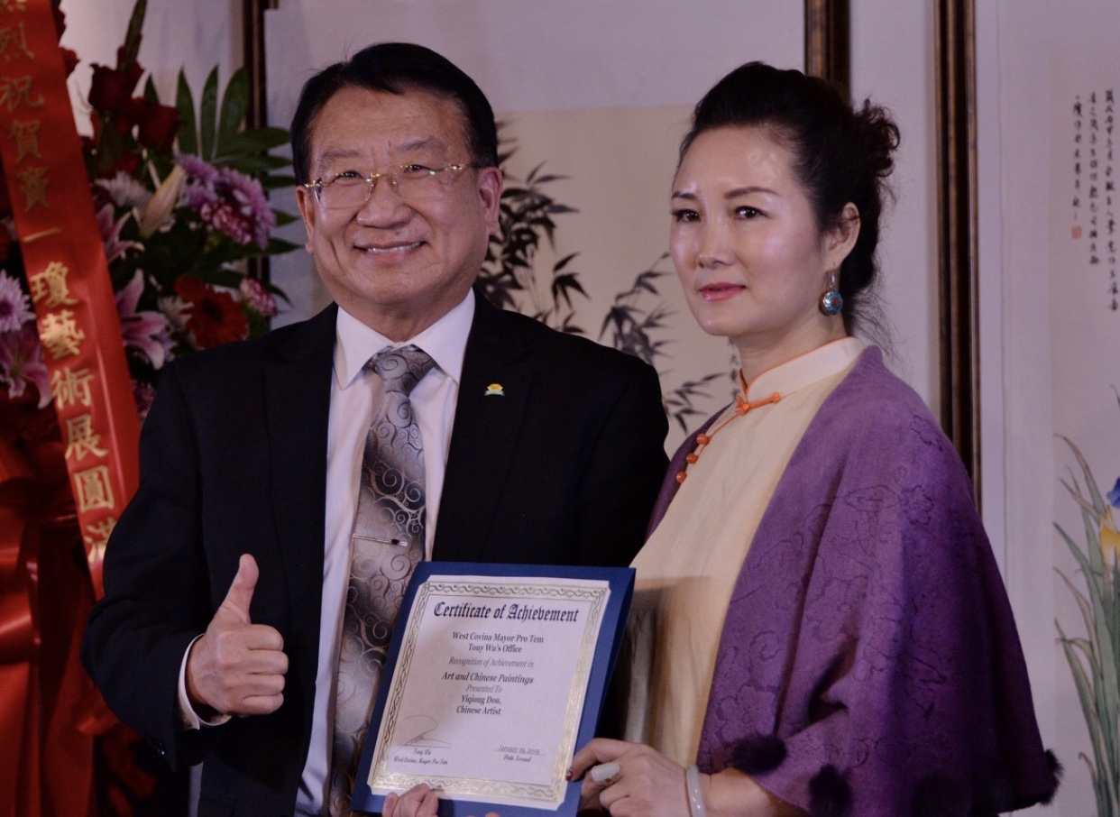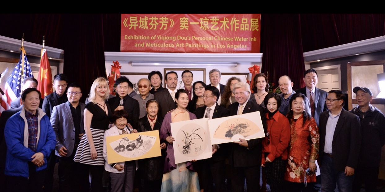 城市新闻1月19日艾尔蒙堤市报导,《异域芬芳》-中国水墨画家窦一琼作品展在艾尔蒙堤市中华艺术宫盛大举行。圣盖博市议员廖钦和,西科维纳市副市长吴桐淮、美国国会议员赵美心代表、核桃市市议员秦振国代表出席,并向窦一琼颁贺状。世界名人俱乐部负责人闫俊安、阳光教育学院代表郑重、好莱坞电影学院代表、画家阿原向窦一琼颁发杰出艺术家和客座教授证书。由双语主持人彭南林主持。